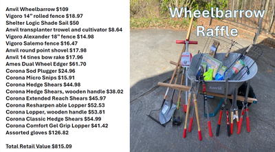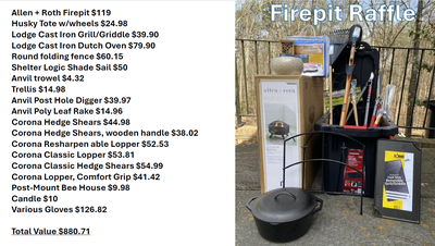 ----- Two fabulous collections are being raffled off. Raffle tickets for a choice of the Firepit collection or the Wheelbarrow collection will be sold at the two check-in sites. Each collection is valued at over $800 and will be on display the day of the Tour. Items include garden/landscape/pruning tools, shade sail, dutch oven, grill/griddle, fencing, fire pit, wheelbarrow, and much more. Raffle tickets are $10 each, or $20 for three. Drawings for the two winners will be held the following week.