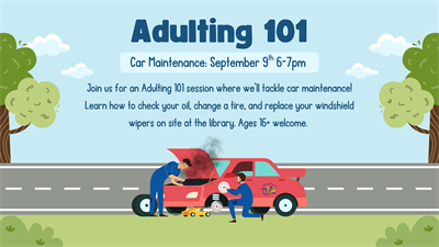 Adulting is hard. We’re here to make it a little easier. Join us for an Adulting 101 session where we’ll tackle car maintenance! Learn how to check your oil, change a tire, and replace your windshield wipers on site at the library. Ages 16+ welcome.