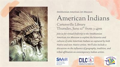 Join us for virtual field trip to the Smithsonian American Art Museum to explore the histories and cultures of some American Indians as captured by both Native and non-Native artists. We’ll also include a discussion on the influence of geography, tradition, and tribal affiliation on contemporary Indian artists.