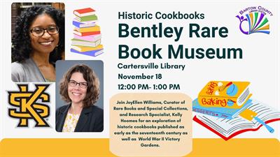 Find Thanksgiving recipe inspiration with KSU’s Bentley Rare Book Museum! Join JoyEllen Williams, Curator of Rare Books and Special Collections, for an exploration of historic cookbooks published as early as the seventeenth century and as late as the twentieth century including wartime cookbooks. Bonus: Bentley Rare Book Museum research specialist, Kelly Hoomes, will discuss WWII Victory Gardens in connection with wartime cookbooks. This program is sure to make you hungry so feel free to bring your lunch.