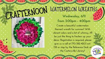 Create a beautiful watermelon themed wreath for summer! With vibrant colors and a bit of whimsy, it'll be just the thing to freshen up your décor. Registration is required, please give us a call at 770-382-4203 ext. 138 or stop by the Reference Desk at the Cartersville Library!