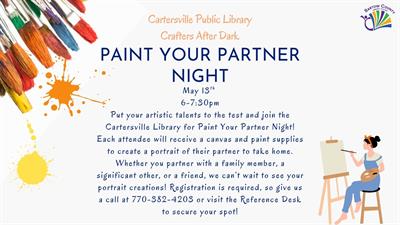 Put your artistic talents to the test and join the Cartersville Library for Paint Your Partner Night! Each attendee will receive a canvas and paint supplies to create a portrait of their partner to take home. Whether you partner with a family member, a significant other, or a friend, we can’t wait to see your portrait creations! Registration is required, so give us a call at 770-382-4203 or visit the Reference Desk to secure your spot!