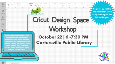 Join us for an introduction to Cricut Design Space, the free app that powers the Cricut cutting machine. Together, we will walk through using the app. Then we will practice a few simple projects using card stock. You are invited to bring your laptop and your Cricut machine. Neither are required to participate. You can register here, or by contacting the reference desk at 770-382-4203 ext. 138.