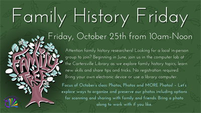 Attention family history researchers! Looking for a local in-person group? Join us in the computer lab at the Cartersville Library as we explore family history topics, learn new skills and share tips and tricks. No registration required. Bring your own electronic device or use a library computer.