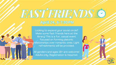 Looking to expand your social circle? Make some fast friends here at the library! This is a fun, casual event focused on forming platonic relationships over romantic ones. Light refreshments will be provided. All genders and ages 18+ are welcome! Registration is required. To register please call 770-382-4203 ext. 138.