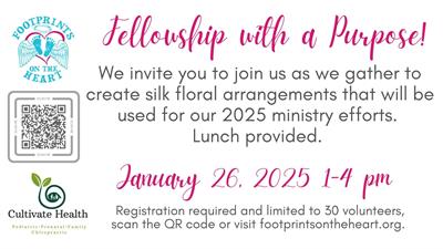 Fellowship with a Purpose will be held at Cultivate Health 1130 N Tennessee Street, Suite C, Cartersville, GA 30120 on January 26, 2025 from 1-4pm. Registration is required and limited to 30 volunteers. Lunch provided: chili & toppings, drinks (tea and water) and dessert. If you have any questions do not hesitate to reach out to Khristie Staines at 770-547-4333 or kstaines@footprintsontheheart.org