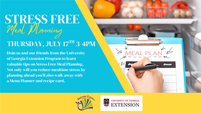 Join us and our friends from the University of Georgia Extension Program to learn valuable tips on Stress Free Meal Planning. Not only will you reduce mealtime stress by planning ahead you’ll also walk away with a Menu Planner and recipe card.