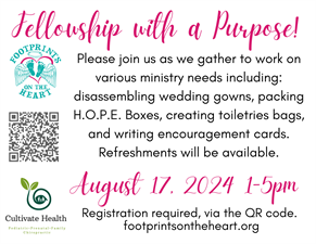 Thank you for your willingness to Fellowship with a Purpose alongside Footprints on the Heart and Cultivate Health. TOGETHER we are impacting the lives of families experiencing pregnancy loss and infant death within Bartow, Floyd, Gordon, Murray, Polk, and Whitfield counties and beyond. Due to the nature of the projects we will be working to complete on this day we are seeking in-person volunteers and financial support volunteers as well.