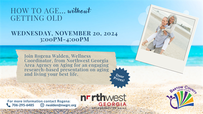 Join Rogena Walden on this interactive, engaging, informative, and fun look at "How to Age Without Getting Old." This program is based on Rogena's recent graduate studies in aging at USC and include her personal anecdotes.