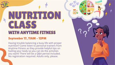 Having trouble balancing a busy life with proper nutrition? Come listen to personal trainers from Anytime Fitness as they provide helpful tips on fueling your body so you can do the activities you want! There will be a Q&A period included. No registration required. Adults only, please.