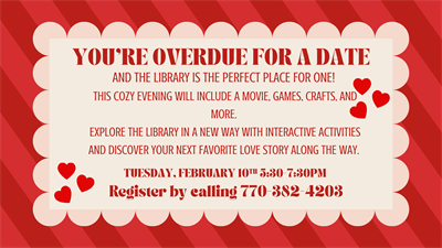 Calling all book lovers! You're overdue for a date, and the Cartersville Library wants to help. Join us for a Valentine's themed date night at the library. We'll be hosting a sip and paint (with love potions), playing a romantic comedy, hosting some fun couple-themed games and having a great bookish night![]()