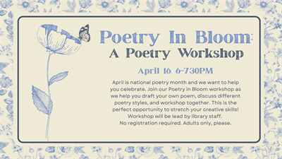 April is national poetry month and we want to help you celebrate. Join our Poetry in Bloom workshop as we help you draft your own poem, discuss different poetry styles, and workshop together. This is the perfect opportunity to stretch your creative skills! No registration required.