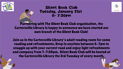 Partnering with The Silent Book Club organization, the Cartersville Library is happy to announce we have started our own branch of the Silent Book Club! Join us in the Cartersville Library’s adult reading room for some reading and refreshments. Drop in anytime between 6-7pm to snuggle up with your current read and enjoy light refreshments and company from 7-7:30pm. This is a great opportunity to gather book recommendations, make friends, and enjoy some one-on-one time with your current reads. Silent Book Club will be hosted at the Cartersville Library the 3rd Tuesday of every month.