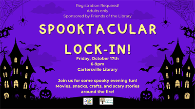 Join us for our first ever Spooktober Lock-in. Enjoy some Halloween movies, spooky snacks, campfire ghost stories, and create some thrift store ghost paintings! Make sure to wear your best costume for a chance to win our costume contest before the night is over! This after-hours event is for adults only. REGISTRATION IS REQUIRED. 25 spots available. If interested, please visit the Ref Desk or give us a call at 770-382-4203.