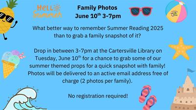 What better way to remember Summer Reading 2025 than to grab a family snapshot of it? Drop in at the Cartersville Library on Tuesday, June 10th from 3-7pm for a family photoshoot opportunity! Families will be able to use a few of our summer themed props in their photos. Photos will be delivered to an active email address free of charge (2 photos per family) after the event. No registration required, just stop in and make some memories.