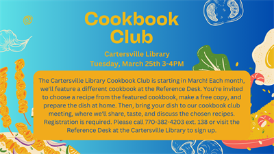 The Cartersville Library Cookbook Club is starting in March! Each month, we'll feature a different cookbook at the Reference Desk. You're invited to choose a recipe from the featured cookbook, make a free copy, and prepare the dish at home. Then, bring your dish to our cookbook club meeting, where we'll share, taste, and discuss the chosen recipes. Registration is required. Please call 770-382-4203 ext. 138 or visit the Reference Desk at the Cartersville Library to sign up.
