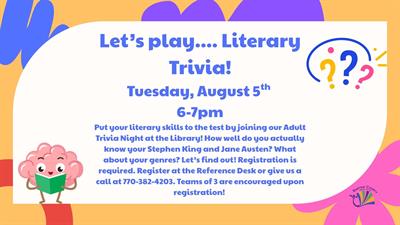 Put your literary skills to the test by joining our Adult Trivia Night at the Library! How well do you actually know your Stephen King and Jane Austen? What about your genres? Let’s find out! Registration is required. Register at the Reference Desk or give us a call at 770-382-4203. Teams of 3 are encouraged upon registration!