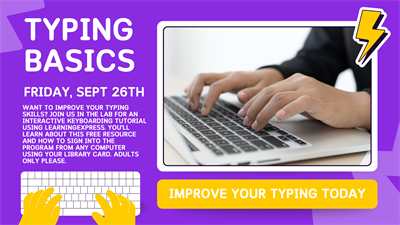 Want to improve your typing skills? Join us in the lab for an interactive keyboarding tutorial using LearningExpress. You'll learn about this free resource and how to sign into the program from any computer using your library card. Adults only please.
